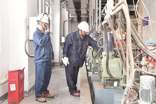 11月24日,成物智服化检分公司钛业二项目部职工沈兴顺与刘文臣(右)正在检查设备。今年以来,该分公司通过强化设备数据、状态监测,提升设备可开动率,增强预防性维护工作的整体成效;严格做好定修周期管理,提高维护工作的规范性与针对性,确保了检修质量客户满意度的显著提高。